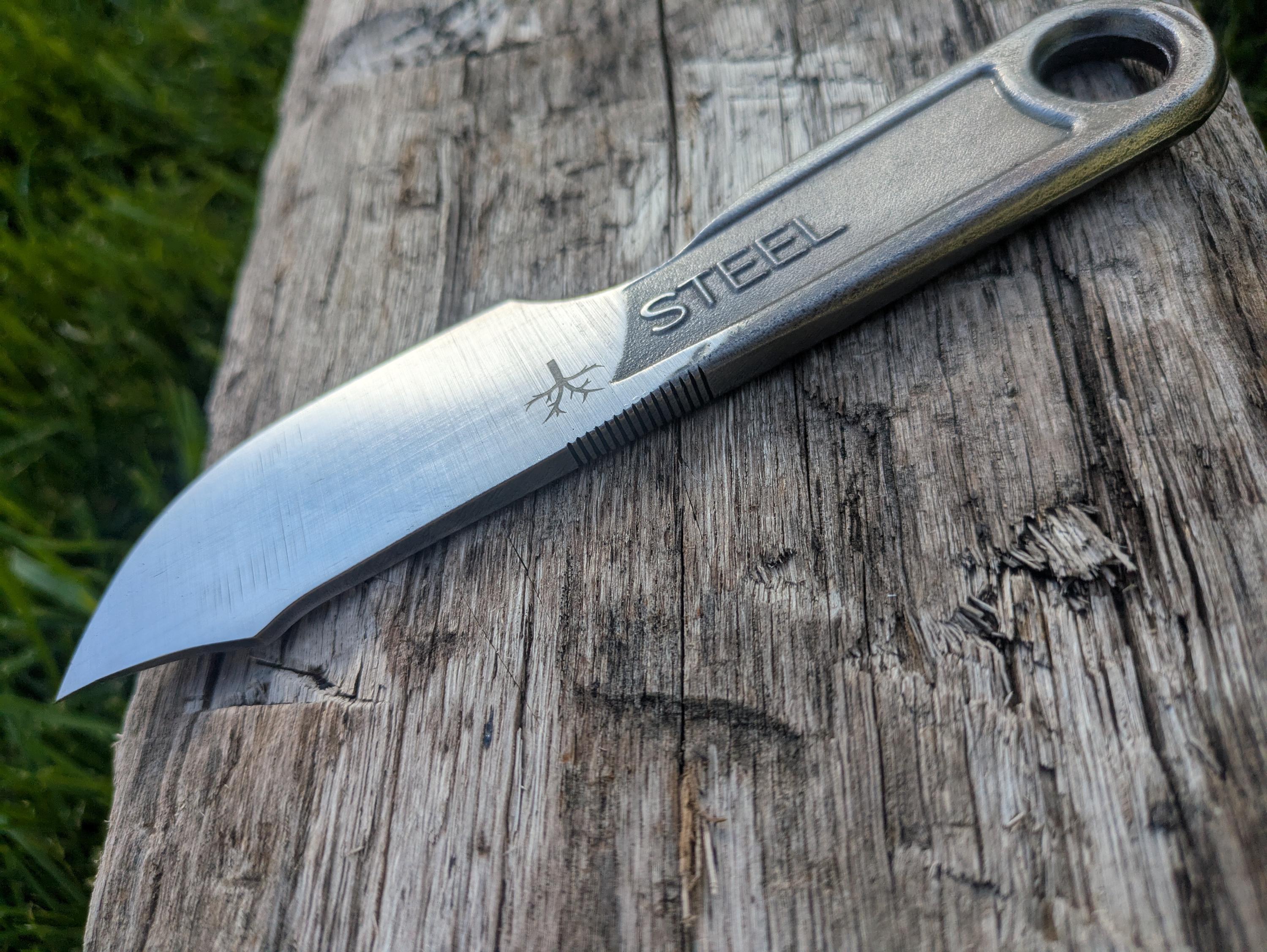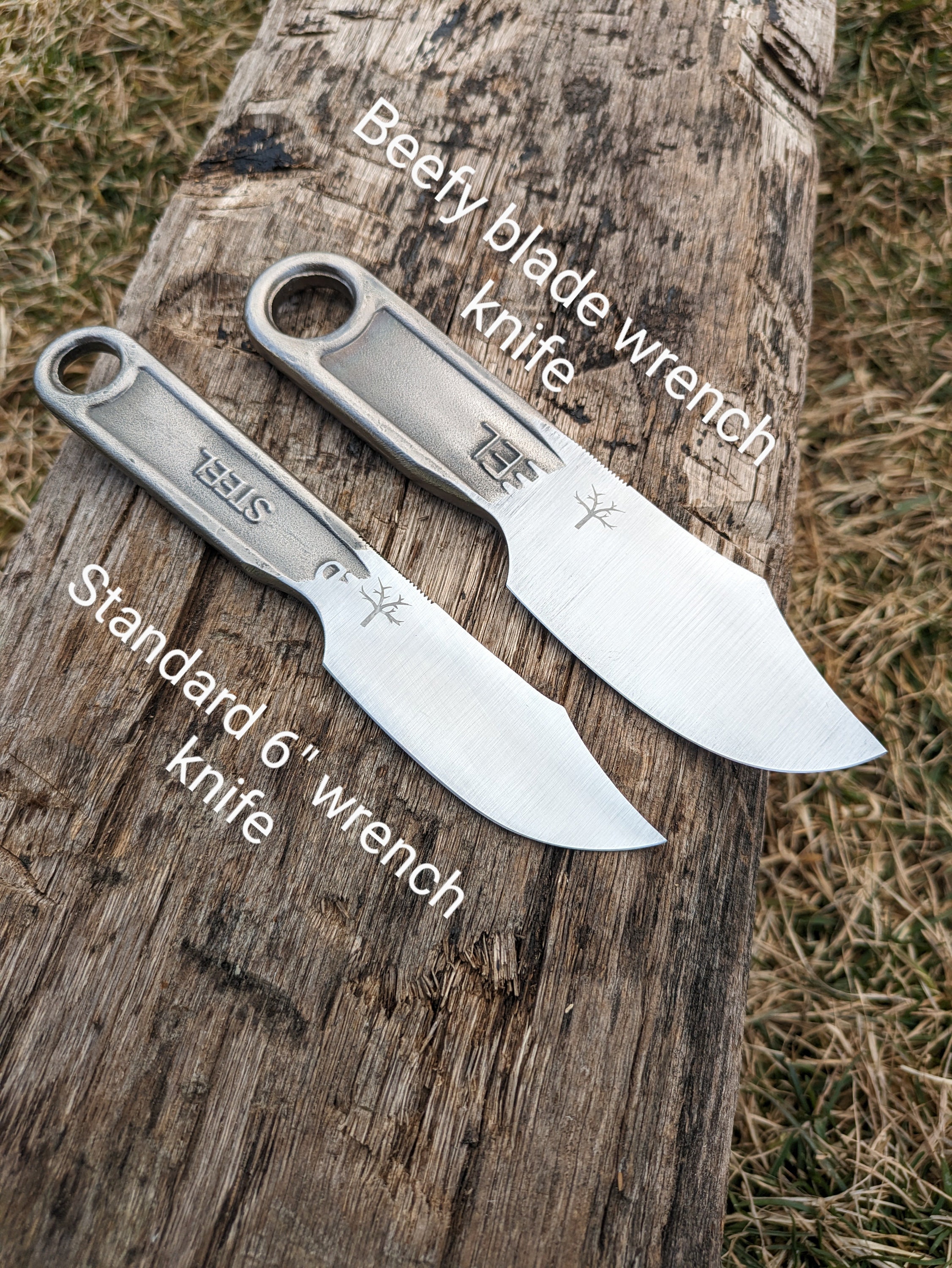 A hand crafted knife forged from a high carbon steel adjustable wrench. The hardened and tempered blade has been hand sharpened and electro-etched with the naked tree maker's mark. A clip point knife offers a stylish, moderately curved edge for good all around cutting, and a keen point. This "beefy blade" knife has been forged from a larger wrench than the standard size knife of the same length. This gives the knife a larger, more comfortable handle. Coin for scale. Comparison photo with standard 6" size is not the individual knife listed.