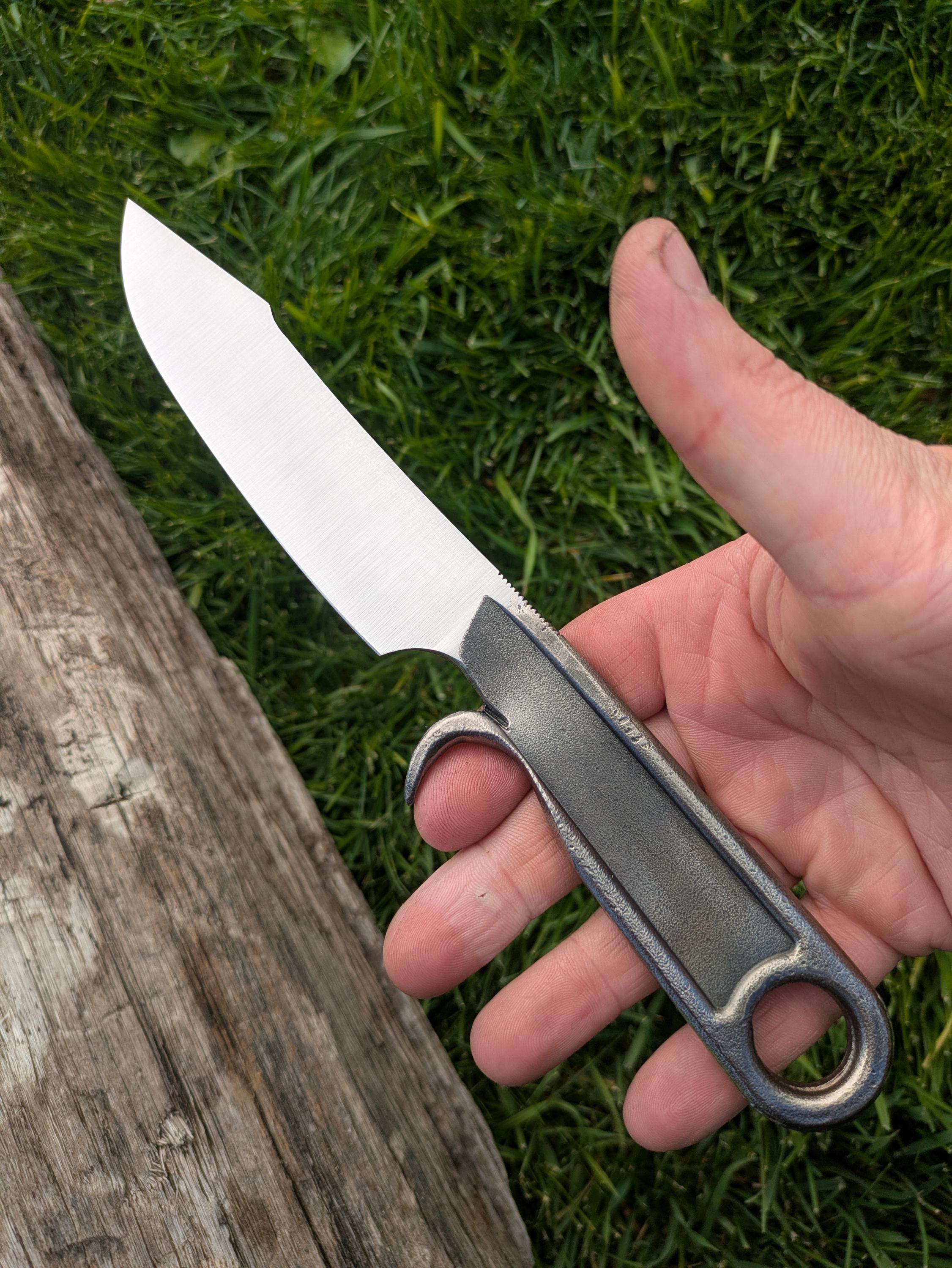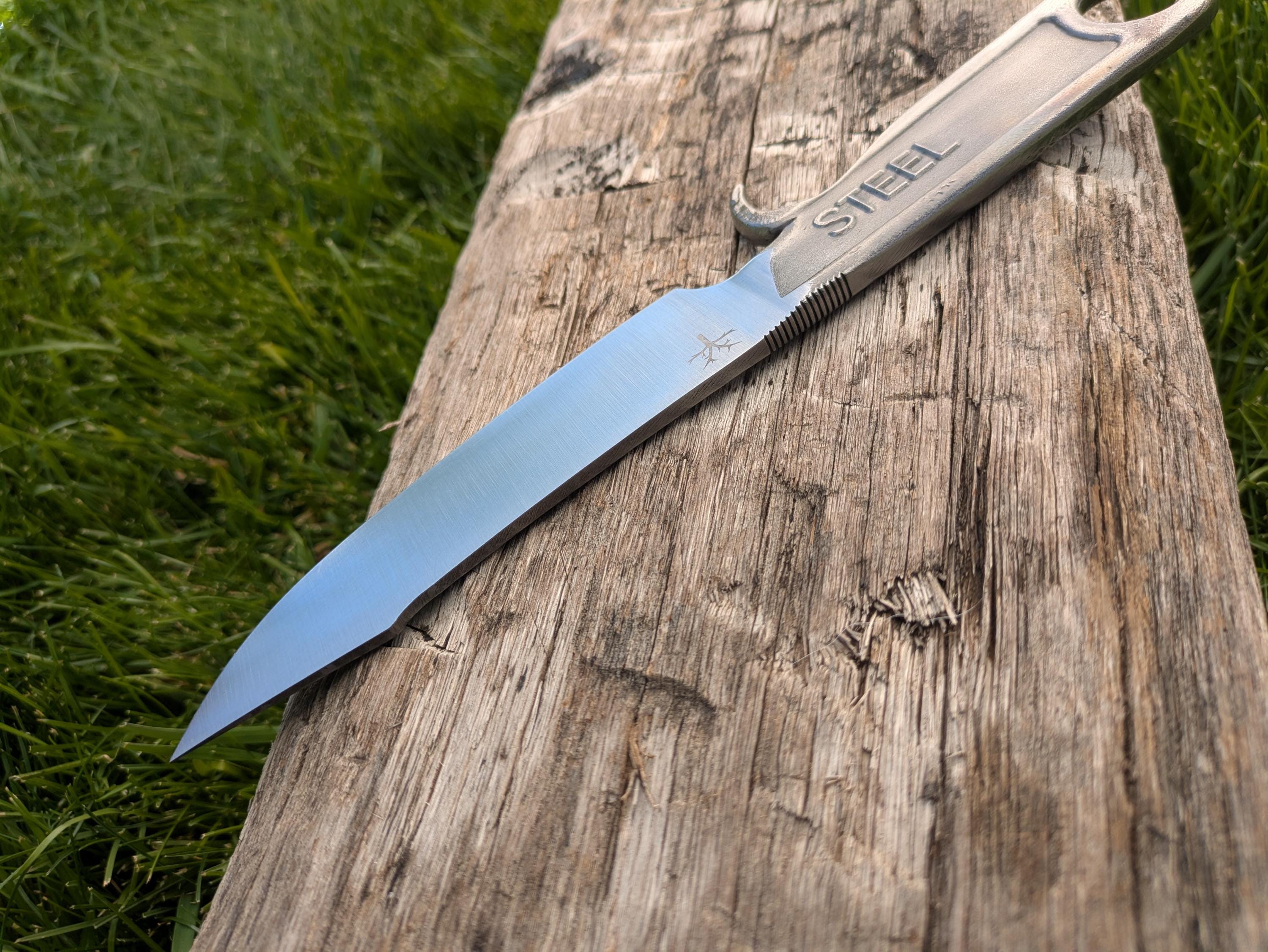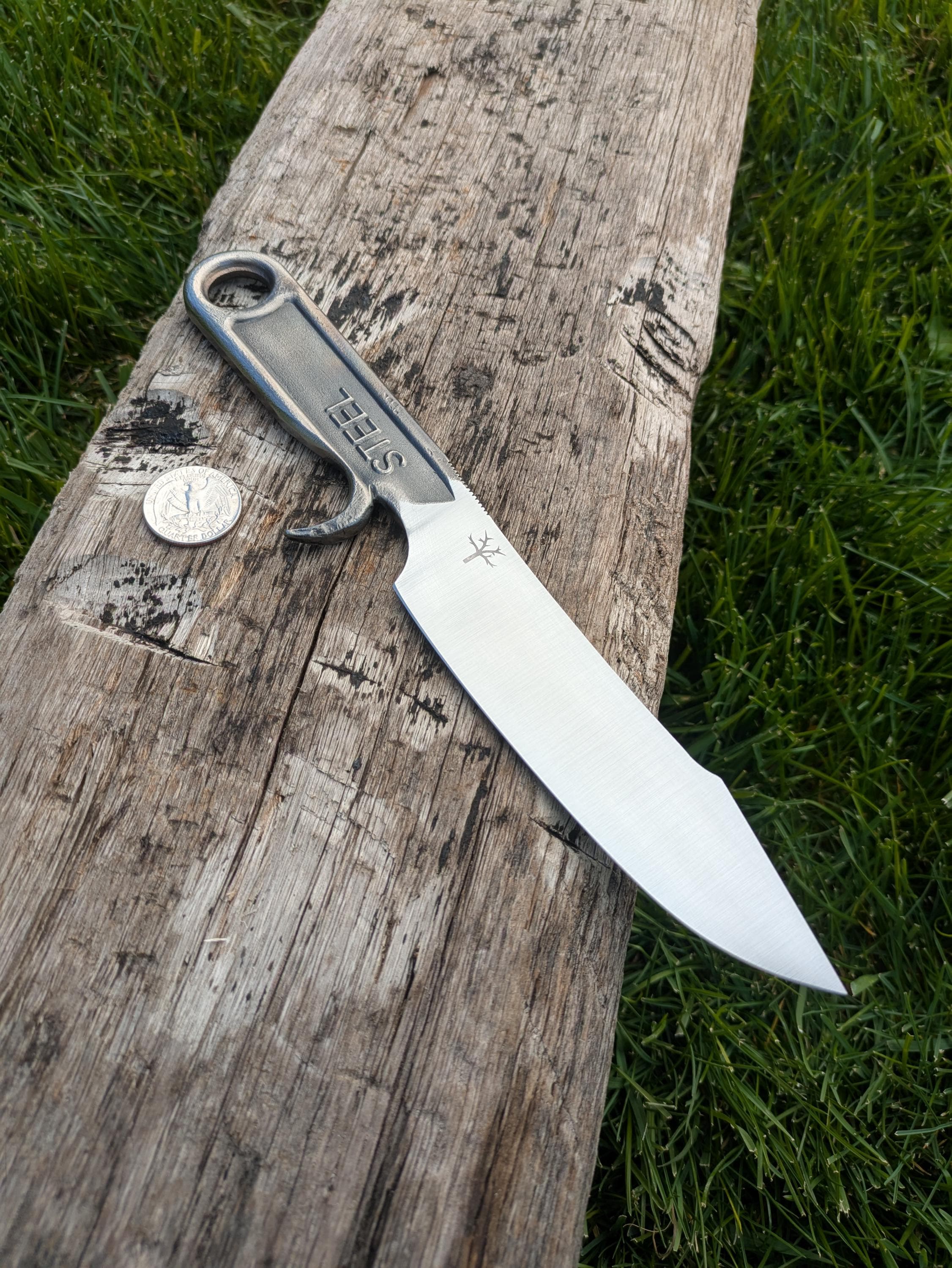 A handmade drop point knife forged from a high carbon steel adjustable wrench. The hardened and tempered blade has been hand sharpened and electro-etched with the naked tree maker's mark. A portion of the handle has been split off to function as a finger guard. Coin for scale.