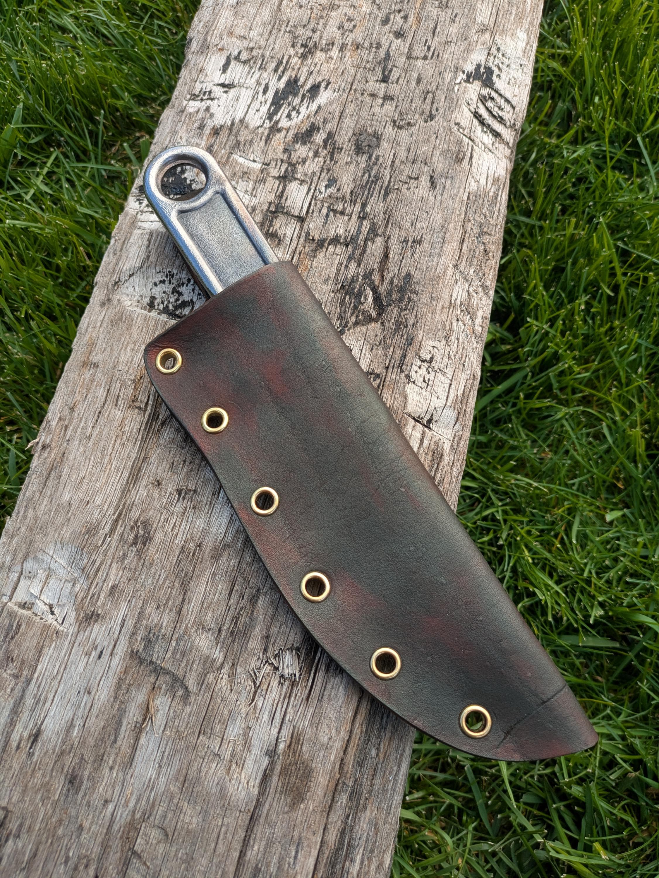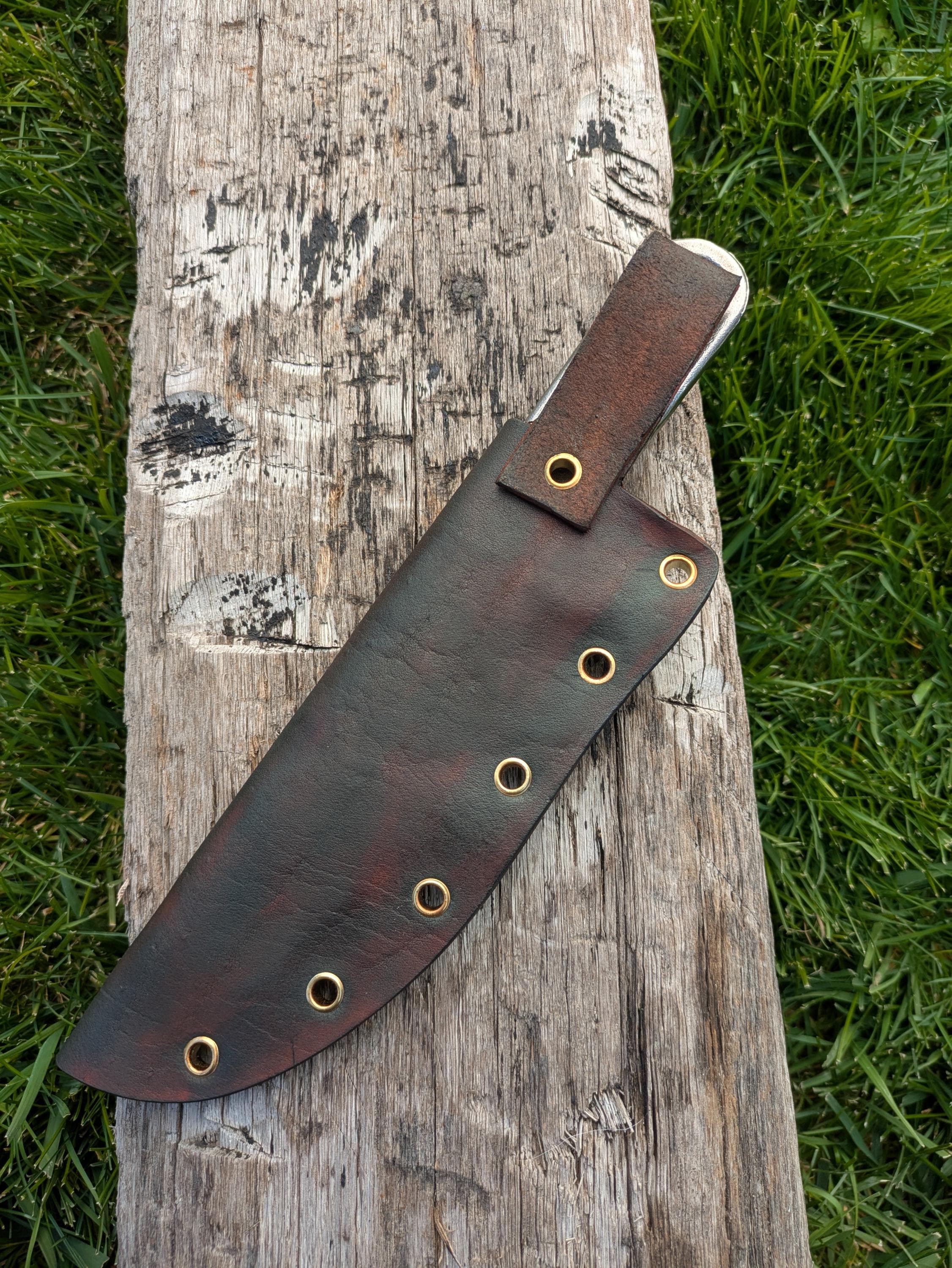 Includes a sheath made from vegetable tanned leather. Dyed brown with brass eyelets.