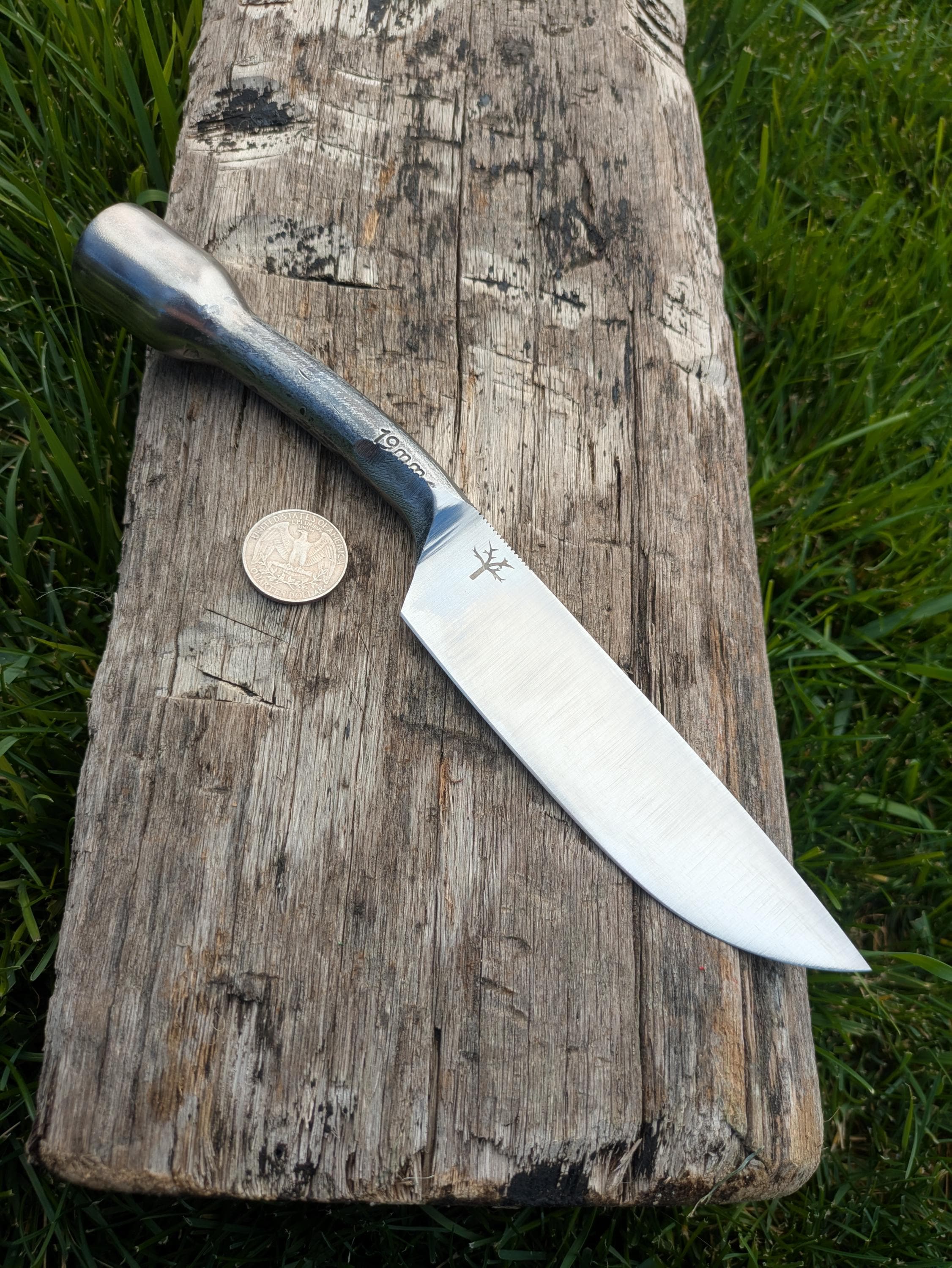 A handmade drop point knife forged from one end of a lug wrench. The knife features jimping on the spine to improve grip. The hardened and tempered blade has been hand sharpened and electro-etched with the naked tree maker's mark. Coin for scale.