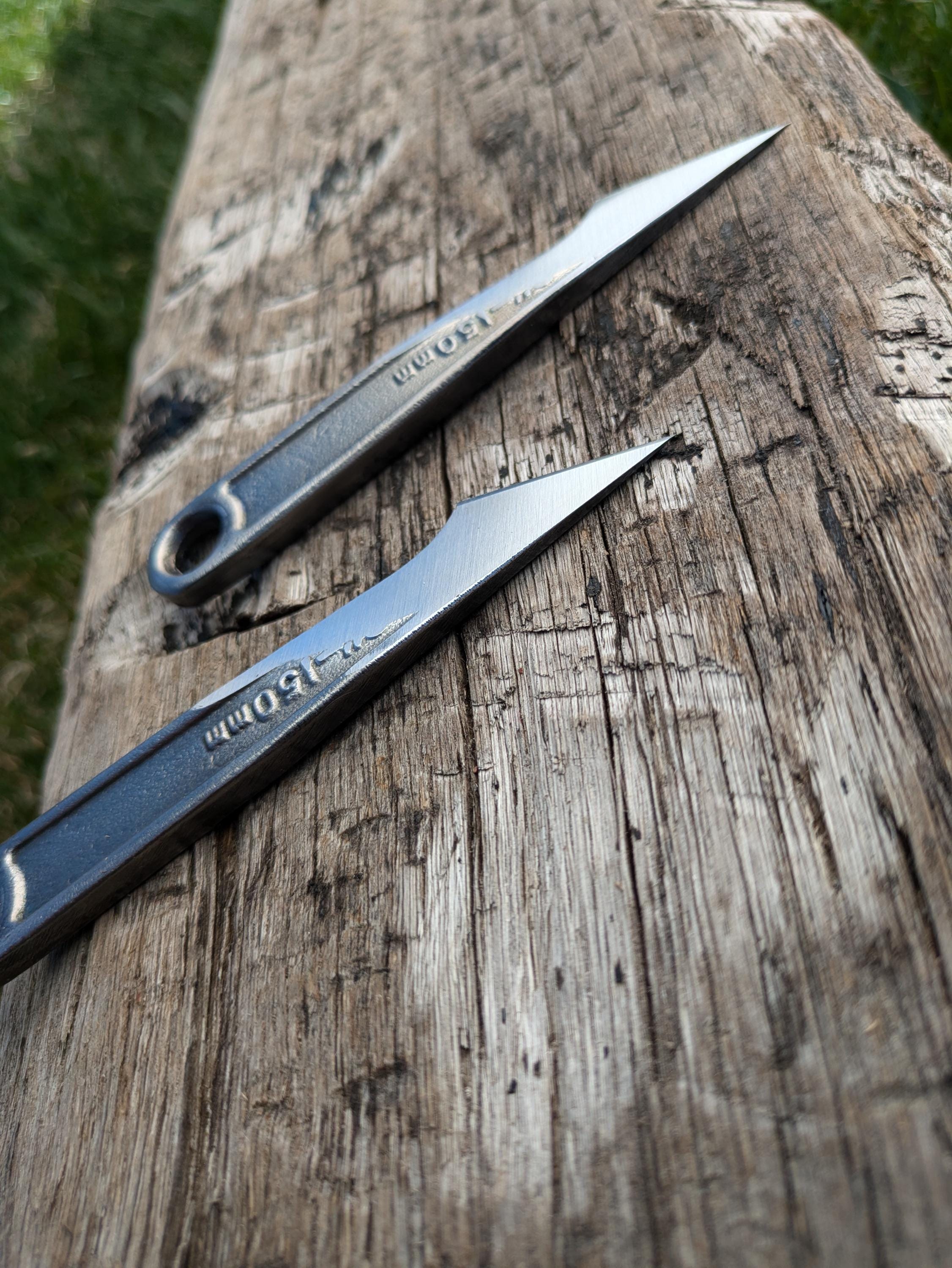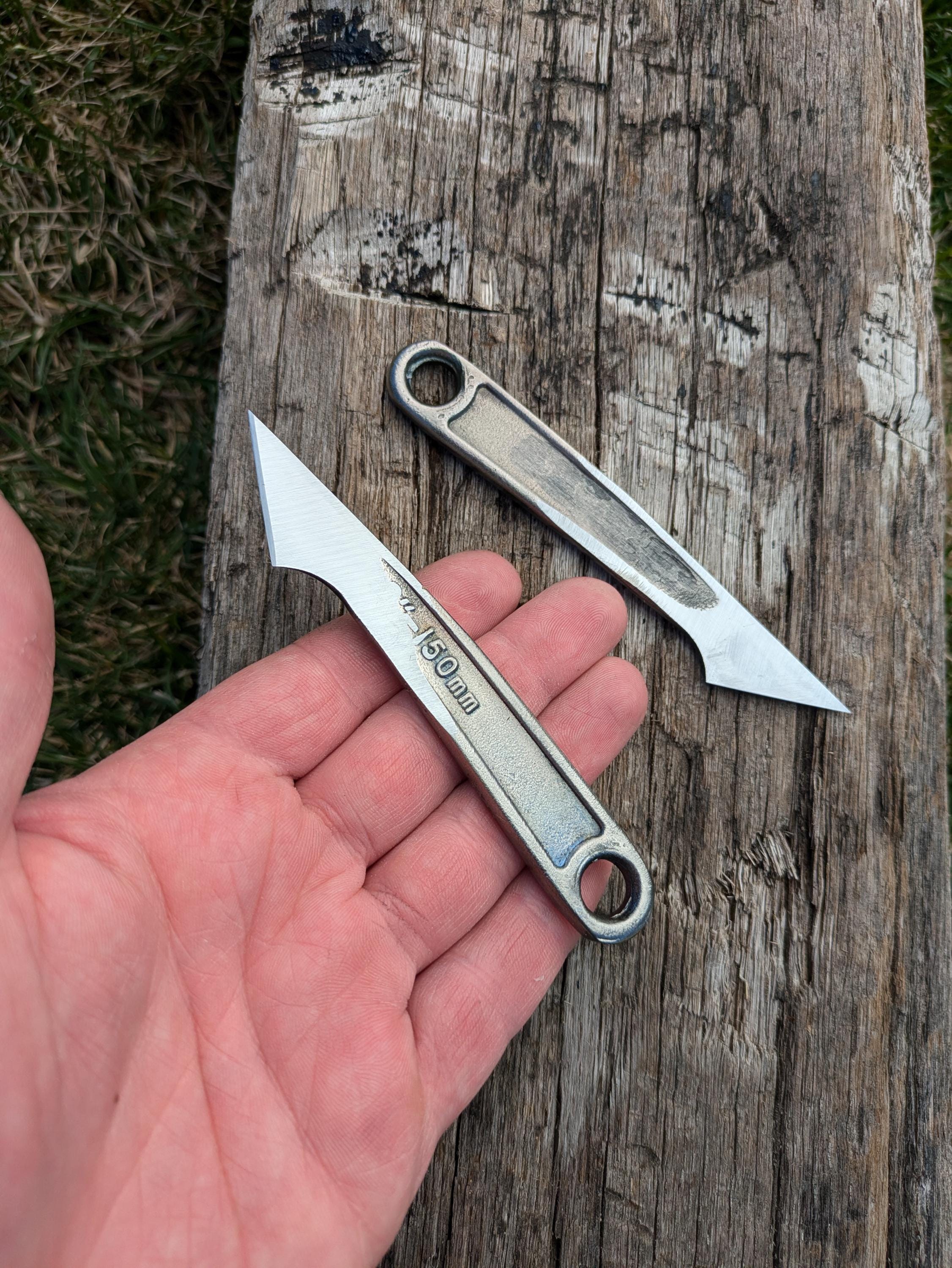 I really needed a pair of kiridashi knives with one R hand bevel and one L hand bevel. Didn’t need them too big since I’ll use these primarily for joinery layout in cutting dovetails, mortise, tenon, dado, etc… where in I want to get right up against my reference mark and in timber where my normal marking knives just won’t reach. I have looked far and wide on Etsy for someone selling a right and left with really no good luck until I came across these. It’s neat that they’re repurposed crescent wrench’s, are the right length, and should serve for generations. They’re shopped sharp, but it will be a few months before I can tell how well I think the hardness holds up to honing. I only stropped them as I do all my hand tools; on kangaroo leather with rouge compound. Will update in a few months, but great product thus far!🫡
